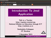 Outline: jmol ਐਪਲੀਕੇਸ਼ਨ ਦਾ ਸੰਖੇਪ ਵਰਣਨ। ਜ਼ਰੂਰੀ ਸਾਫਟਵੇਅਰ। ਪੂਰਵ ਜ਼ਰੂਰਤਾਂ ਉਬੰਟੁ/ਲਿਨਕਸ ਸਿਸਟਮ ਉੱਤੇ Jmol ਐਪਲੀਕੇਸ਼ਨ ਖੋਲ੍ਹਣਾ। ਪ੍ਰੋਗਰਾਮ ਇੰਟਰਫ਼ੇਸ ਸੱਮਝਾਉਣਾ (ਮੈਨਿਊ ਬਾਰ, ਟੂਲ ਬਾਰ, ਪਾਪ-ਅਪ ਮੈਨਿਊ ਅਤੇ..